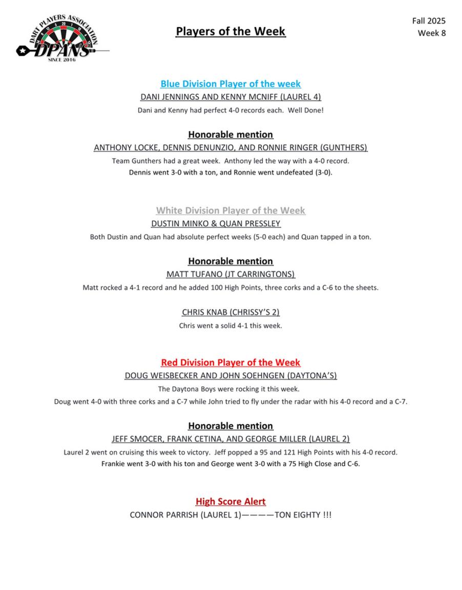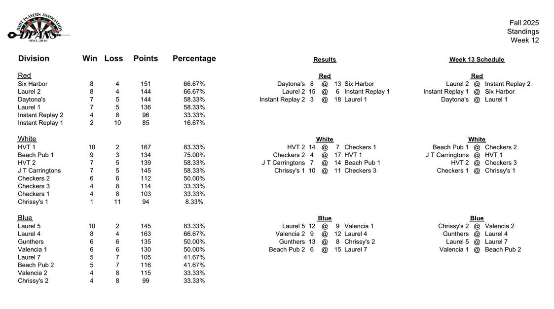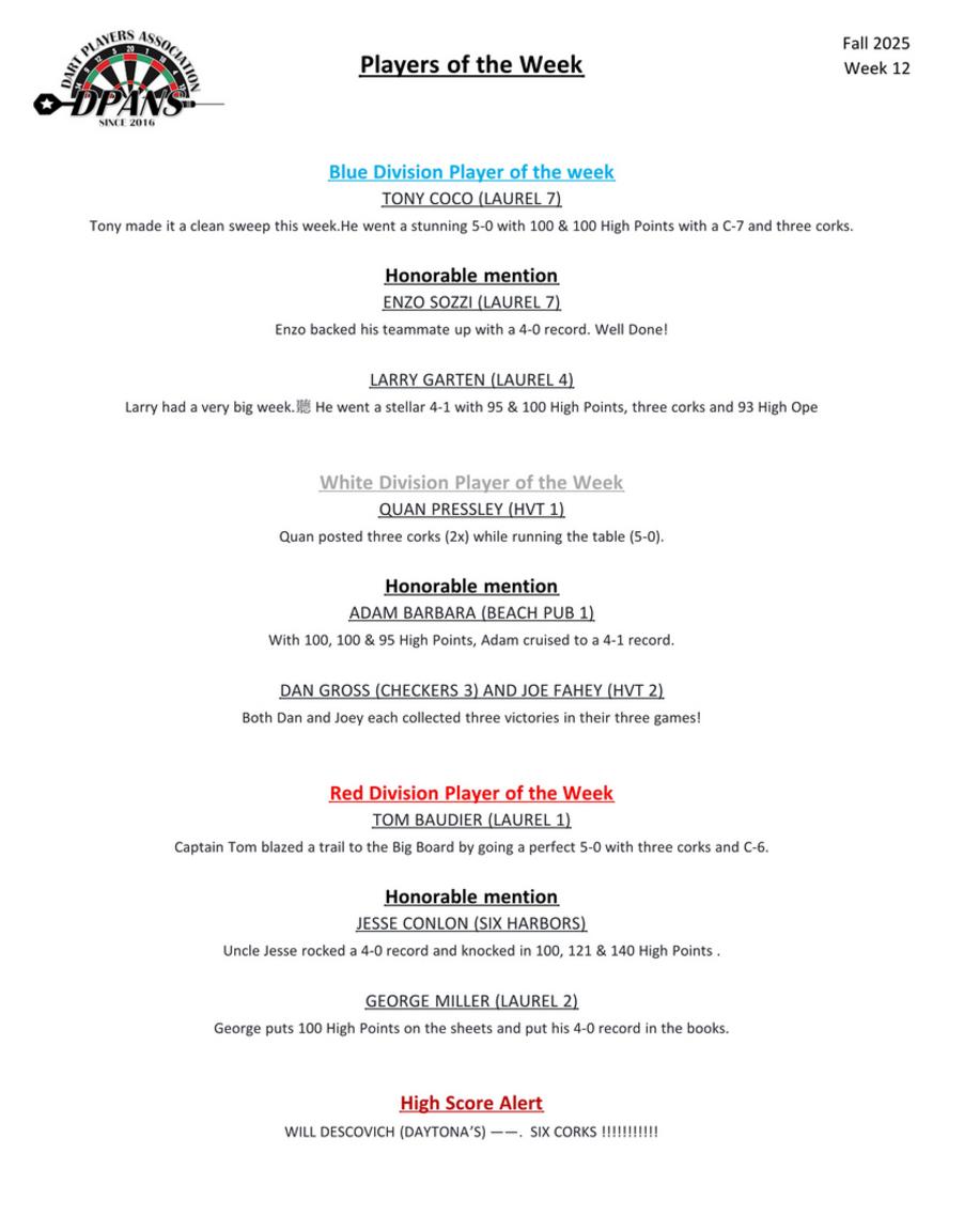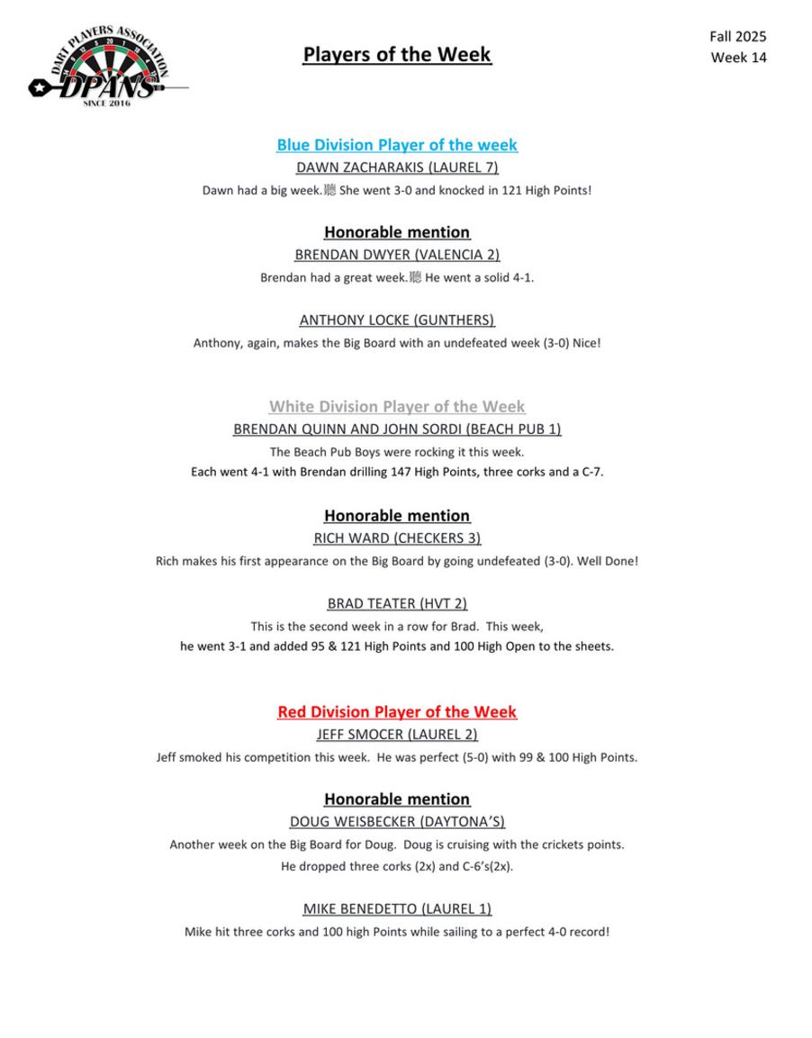 WHITE & BLUE DIVISION WILL BE GOING BACK TO ONE WEEK FINAL.