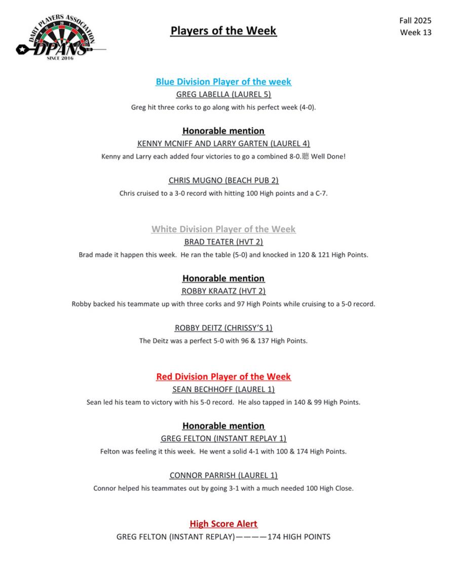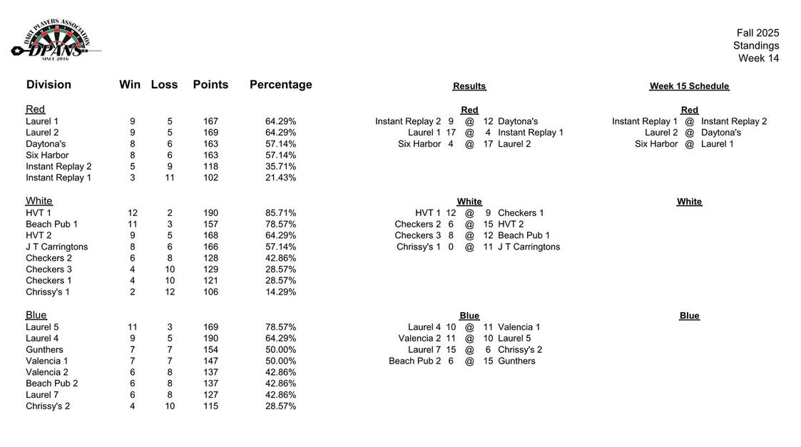 WHITE & BLUE DIVISION WILL BE GOING BACK TO ONE WEEK FINAL.